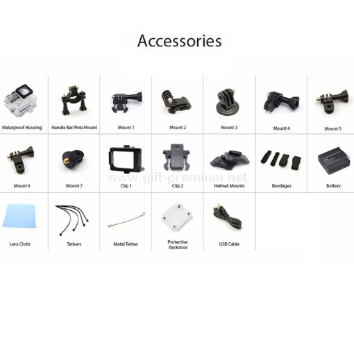 10. 配件:防水殼,防水殼底座, ,單車支架,多功能夾,相機支架,頭盔底座,綁帶,擦機布, 3M膠, USB線, 胸帶轉接底座, 長支架,短支架,短款轉90°支架,防丟繩